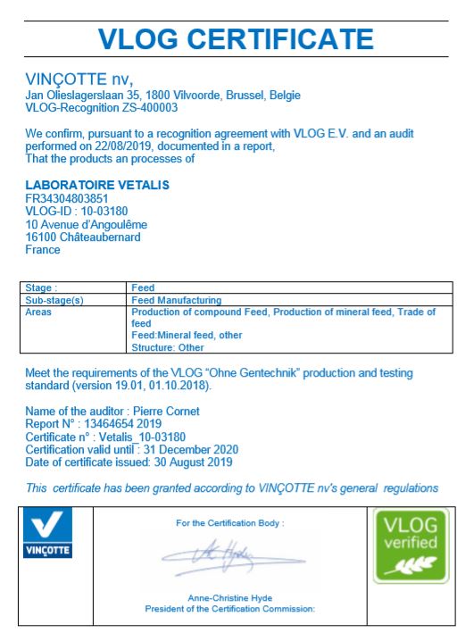 Cette certification, obtenue par Vétalis depuis 2009, permet de garantir les bonnes pratiques de gestion et de fabrication avec la mise en place d’un système qualité efficace.