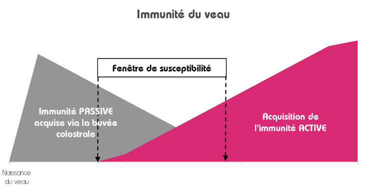 Il existe lors de l’acquisition de cette dernière une fenêtre de susceptibilité, aussi appelée « trou immunitaire », située vers 3 à 4 semaines de vie chez le veau . Cette fenêtre est variable suivant la prise colostrale du veau, le veau en lui-même et les conditions de l’élevage.
