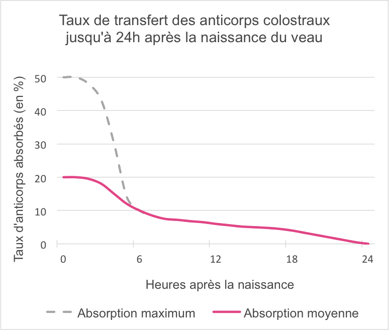 La prise du colostrum doit être rapide afin que l’immunité passive soit la plus efficace possible et que le veau soit protégé au plus vite. Mais c’est avant tout parce que la perméabilité des intestins est réduite au fil des heures : 12h après la naissance les intestins ne laissent passer plus que 50% des anticorps absorbables, et plus rien au-delà de 24h.