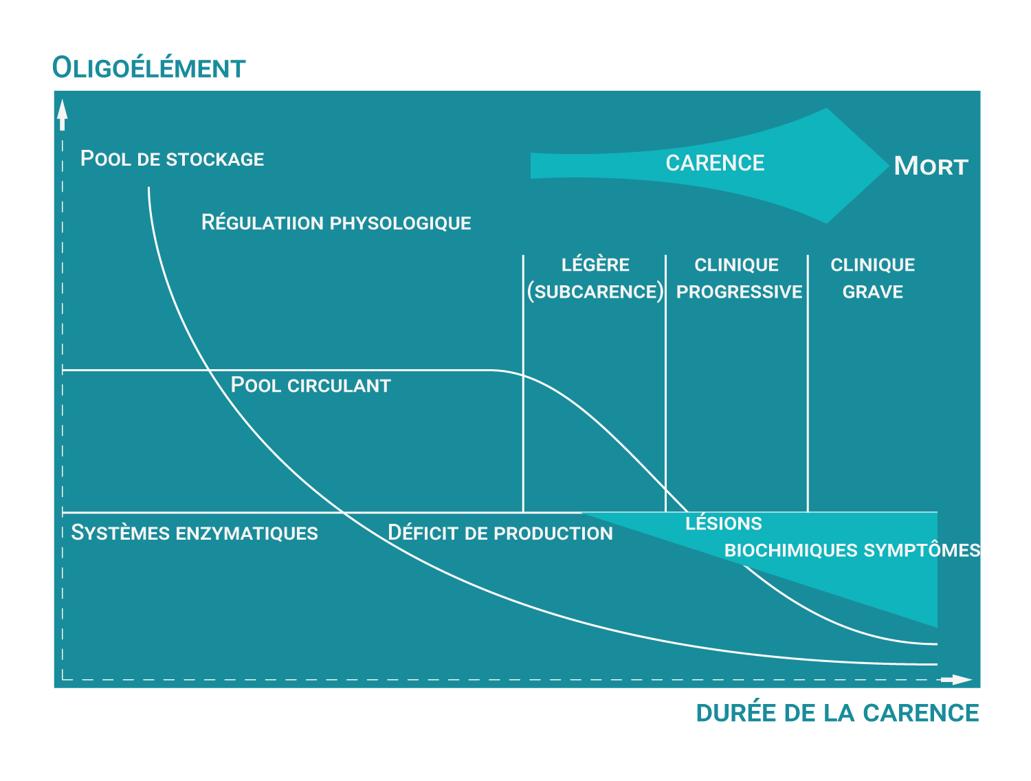 Il est toutefois important de noter que lors d’un apport insuffisant ou d’un défaut d’ingestion, ce sont en priorité les organes de stockage qui sont mobilisés. Ainsi les réserves diminuent sans conséquence clinique dans un premier temps, permettant le maintien des concentrations circulantes ainsi que l’activité des différents systèmes enzymatiques (figure ci-contre). Si la carence persiste ou s’accentue, les taux plasmatiques diminuent alors et le fonctionnement des voies métaboliques est altéré. Les lésions biochimiques apparaissent se traduisant par une baisse des performances de production puis des signes cliniques plus sévères apparaissent (Lamand, 1995).
