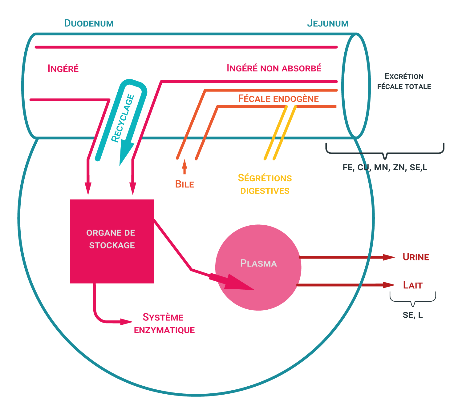 Les oligo-éléments sont des éléments qui, une fois absorbés dans le tractus digestif, ne sont ni catabolisés ni consommés au cours d’une réaction chimique. En effet, dans l’organisme, on les retrouve comme cofacteurs enzymatiques ou liés à une molécule fonctionnelle. Une fois la réaction qu’ils catalysent effectuée ou lorsque les molécules auxquelles ils sont liés sont détruites, ces éléments traces métalliques sont libérés. Ils sont alors, soit recyclés et utilisés dans la même cellule, pour une autre synthèse, soit libérés dans la circulation sanguine et recaptés par d’autres cellules, soit ils passent dans la salive ou dans la bile et subissent une nouvelle absorption digestive (figure ci-contre). Les oligo-éléments ne circulent donc pas de manière libre et aléatoire dans l’organisme : leur métabolisme est finement régulé depuis leur absorption jusqu’à leur élimination (Siliart, 2011).