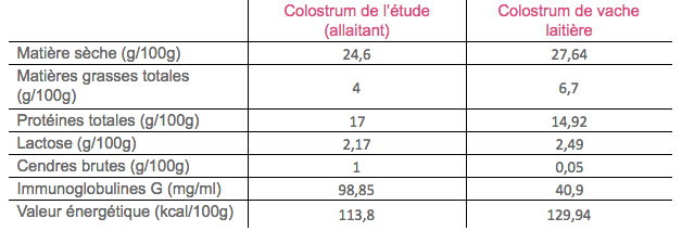 Ce colostrum est un concentré d’énergie, de vitamines et de protéines, dont les quantités sont respectivement trois, dix et quatre fois plus élevées que dans le lait. Il contient également des oligo-éléments, des hormones et des facteurs de croissance.