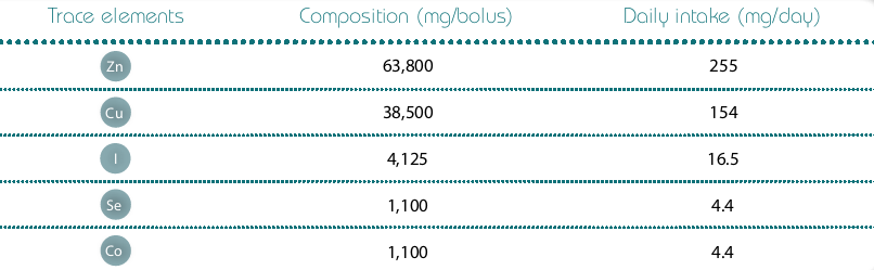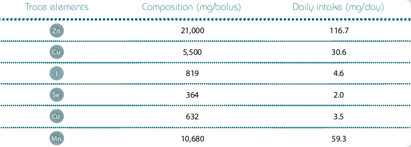 This bolus provides the following trace elements (Copper, Zinc, Iodine, Cobalt, Selenium & Manganese) throughout the grazing period.